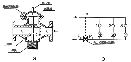 ZY47型自力式壓差控制閥(氮封閥)按照安裝在供水管上還是回水管上,分為供水式結(jié)構(gòu)和回水式結(jié)構(gòu),二者不可互換使用。圖1a為回水式結(jié)構(gòu)示意圖。圖1b為其安裝位置示意圖。圖中P1為網(wǎng)路的供水壓力,P2為被控環(huán)路的回水壓力,P3為網(wǎng)路的回水壓力。 | |||||||||||||||||||||||||||||||||||||||||||||