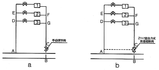 ?。?)對(duì)于具有多個(gè)支路的環(huán)路,裝設(shè)ZY47型自力式壓差控制閥,可以達(dá)到兩個(gè)目的:a、吸收外網(wǎng)的壓力波動(dòng),使被控環(huán)路的水力工況不受外網(wǎng)壓力波動(dòng)的影響。b、削弱各支路間的調(diào)節(jié)干擾(即一個(gè)支路的調(diào)節(jié)對(duì)其它支路的流量所產(chǎn)生的影響)。對(duì)于第a條是顯而易見(jiàn)的;對(duì)于第b條,這里與裝設(shè)手動(dòng)調(diào)節(jié)閥作一個(gè)對(duì)比分析。